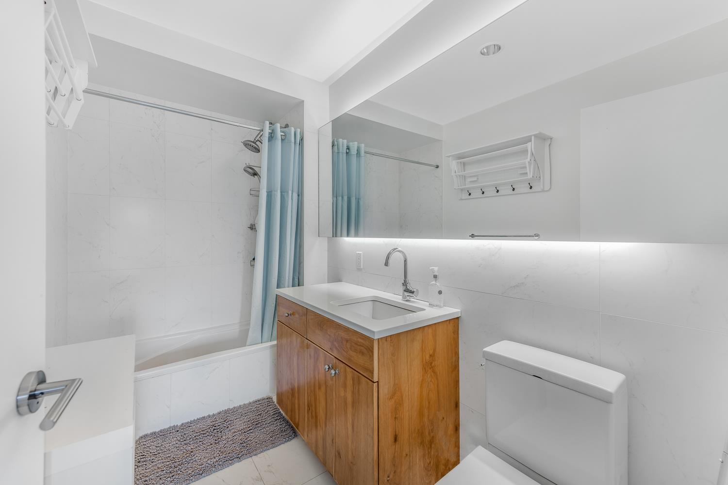 The king-size primary bedroom offers a walk-in closet and en-suite bath, while the second bedroom fits a queen-size bed. 2nd bathroom with a deep soaking tub. Additional features include an in-unit washer/dryer.