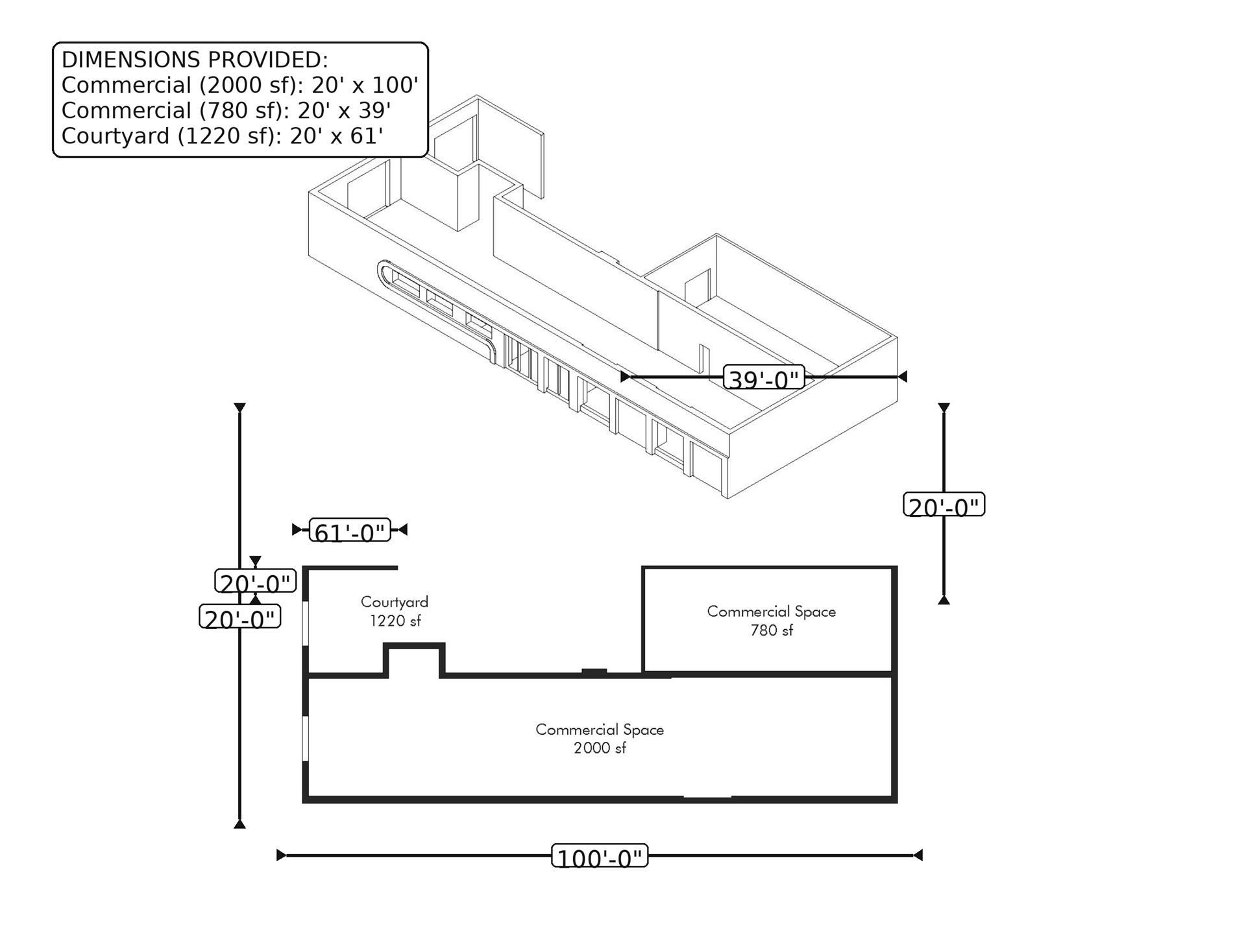 The space has two buildings one at 2000 ft another at 720 sf. All this complimented by a central 1280 sf Court Yard.