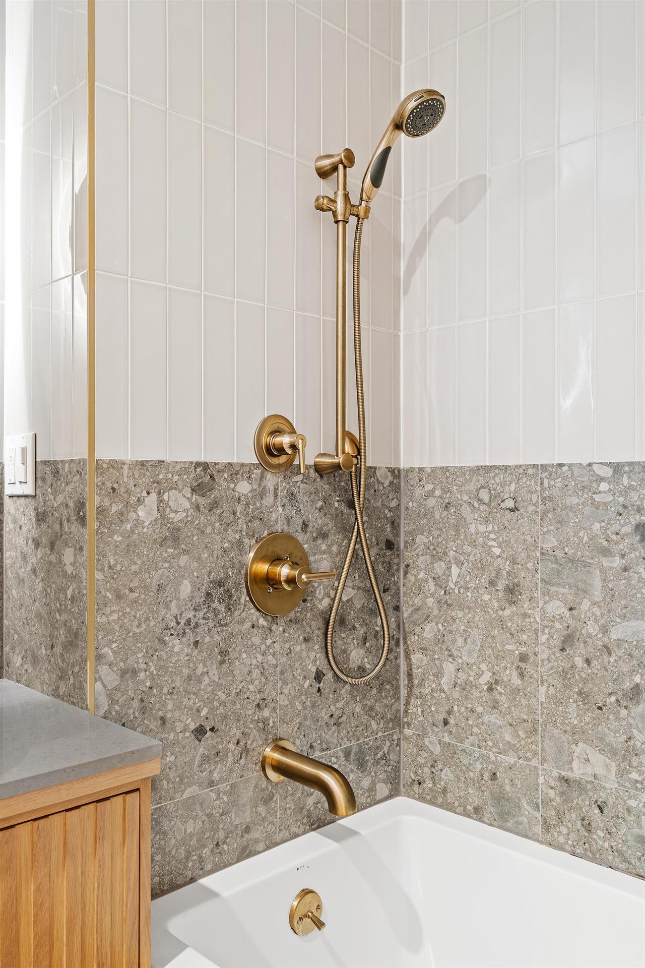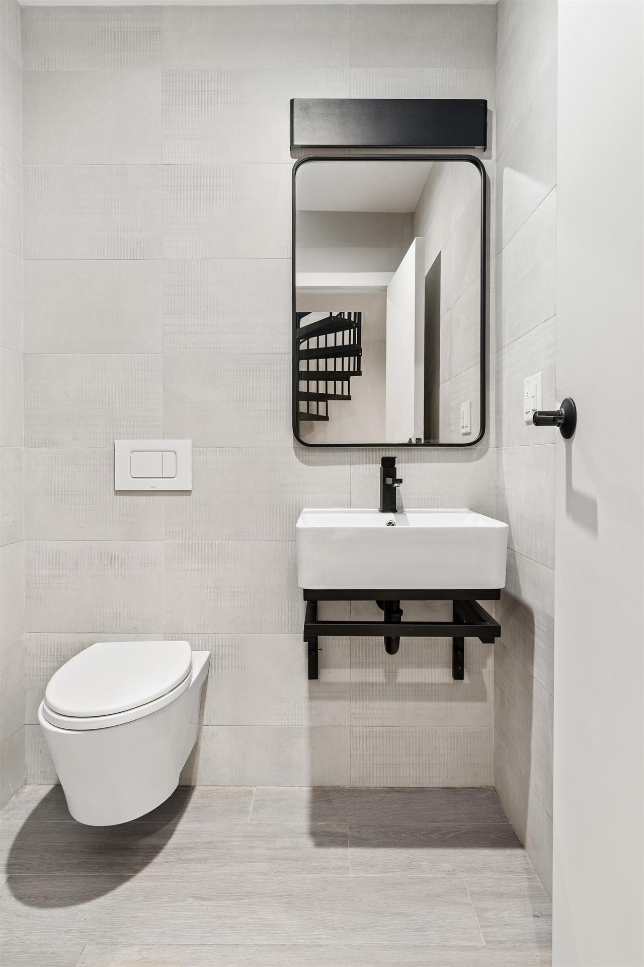 The upper level has a top of the line kitchen equipped with a Bosch appliance package, gray quartz countertops, and custom hard wood cabinets. The open space on this floor can be used as a dining room or a living room depending on your needs. There is a queen size bedroom on this floor as well as a full bathroom.