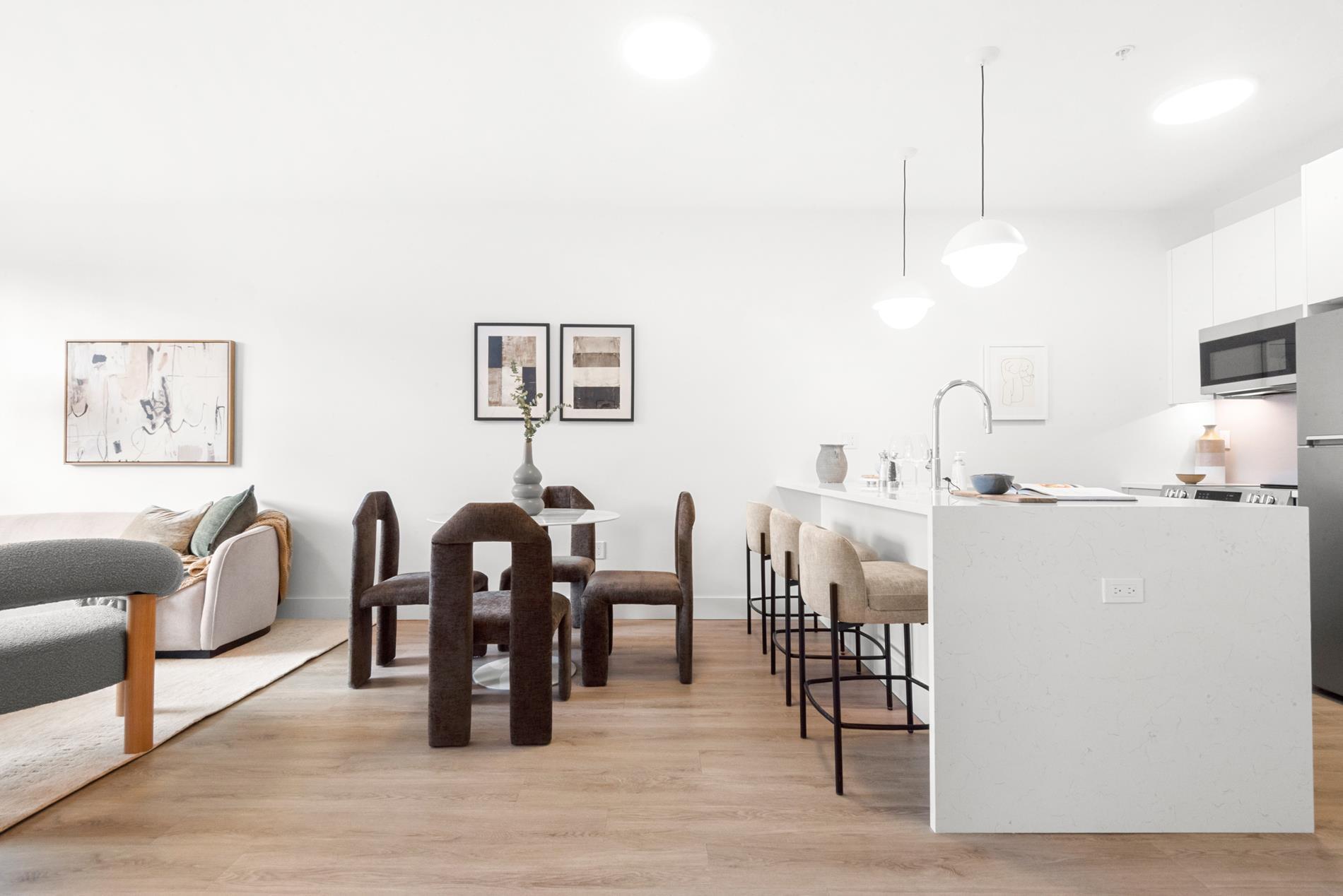 Residences — a mix of studio, 1- and 2-bedrooms— bestow an immediate sense of space and light; composed with finishes that blend flawlessly together to create a thoroughly modern home. All are executed with superior design elements: wide plank hardwood floors, expansive black-framed oversized windows, LED lighting and generous closet space. 1-bedroom units are uniquely crafted with a den space for added versatility. Bright from every angle, these spacious apartments are enveloped in plenty of natural light. It all comes together with a muted, neutral color palette that is ready for you to make your own.