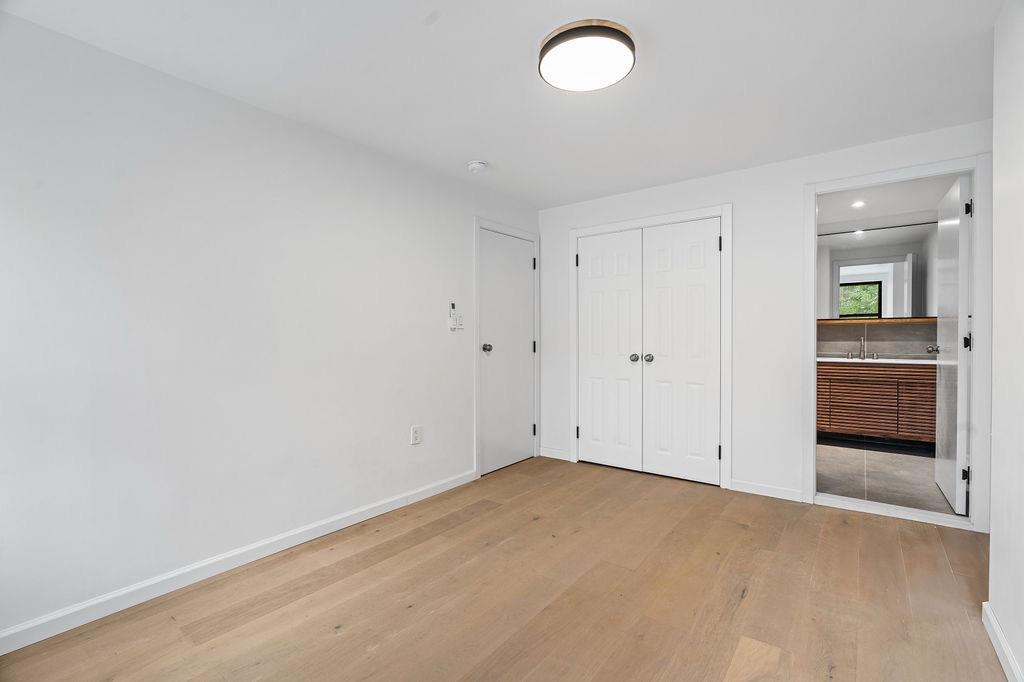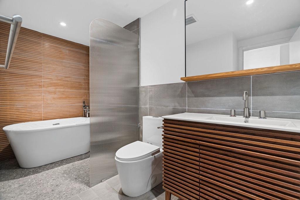 On the garden level, you’ll find three generously sized bedrooms and two full bathrooms. The primary suite overlooks the serene backyard and features an en-suite bath with double vanities, a luxurious rain shower, and a deep soaking tub.