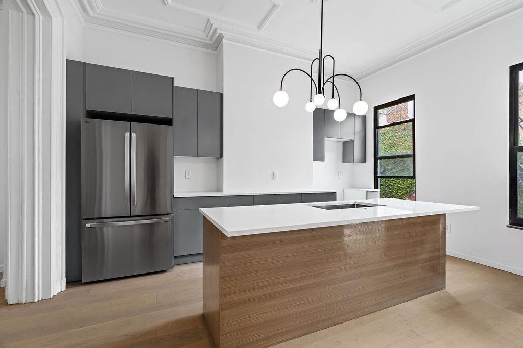 The parlor floor welcomes you with a stunning open-concept living and dining area featuring 10-foot-plus ceilings, elegant finishes, and abundant natural light. The space flows seamlessly into a large chef’s kitchen equipped with stainless steel appliances, a standalone island, ample pantry storage, and an adjacent half bath. A private deck extends from the kitchen, offering a seamless indoor-outdoor living experience.