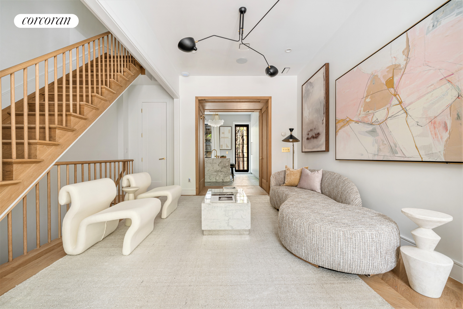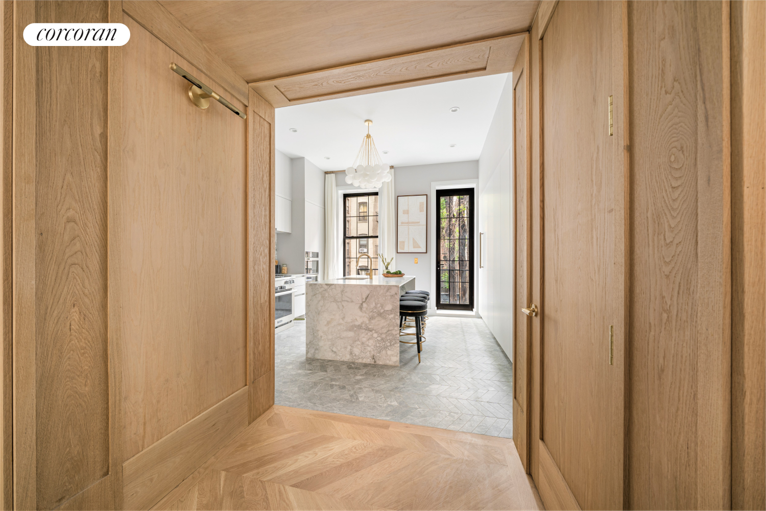 Masterfully renovated to perfection, the parlor floor boasts a living and dining area with both southern and northern exposures and features amazing soaring ceiling heights, beautiful white oak herringbone wood flooring as well as a powder room appointed with a marble vanity, black marble flooring with faucet in brass finish. The open concept state-of- the-art gourmet kitchen comes with all the bells and whistles combining brilliant engineering with vast customization.