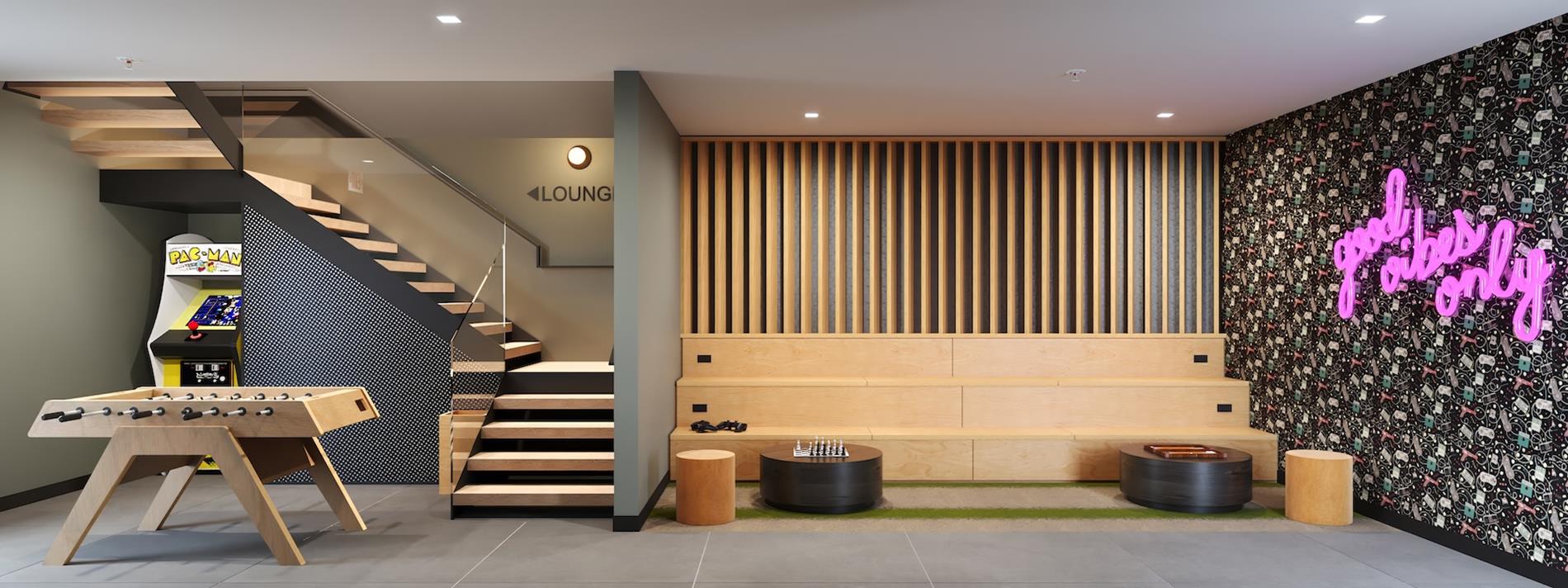 The second-floor game room brings fun and connection home with foosball, vintage arcade machines, and modern gaming consoles. On the third floor, a fully furnished indoor lounge offers a cozy place to relax, enjoy conversation, or wind down with a drink.