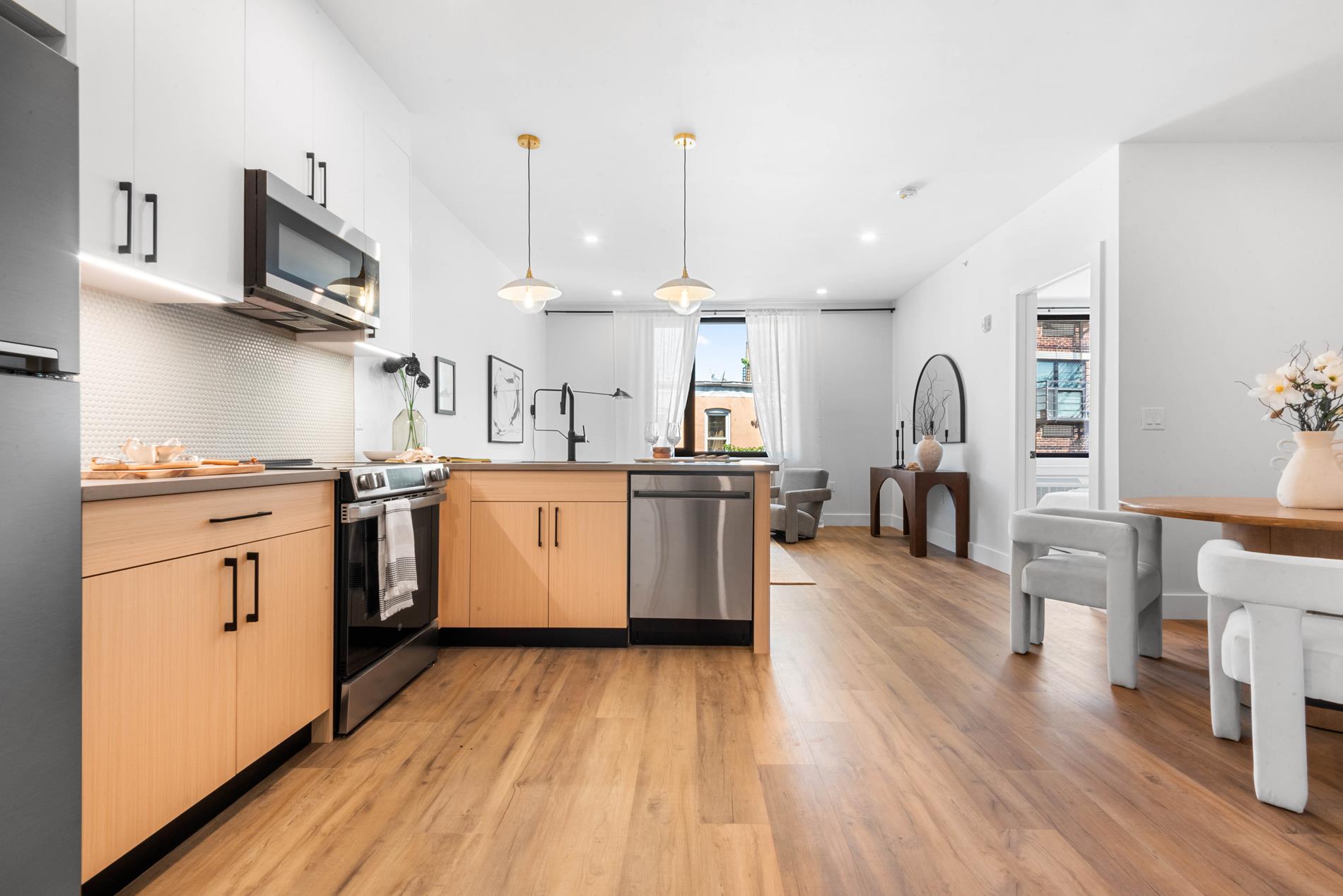 Kitchens are elegantly functional, made for everyday ease and entertaining alike. White matte upper cabinets pair beautifully with Pearwood lower units, all set against a matte gray penny tile backsplash. Fossil gray quartz countertops, a matte black Hansgrohe faucet, and an undermount sink complete the look. Top-tier appliances include a paneled Beko refrigerator and stainless-steel Samsung range, microwave, and dishwasher.