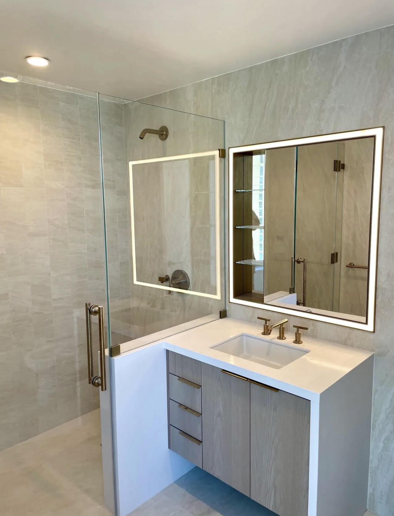The spacious primary suite enjoys double-exposure northeastern views and a large walk-in closet. Its spa-inspired ensuite bath is beautifully appointed with porcelain finishes, light bronze Kohler Purist fixtures, an ash and white quartz vanity with integrated lighting, open glass shelving, a frameless glass shower, and a Toto one-piece toilet. The well-proportioned second bedroom offers excellent closet space, while the adjacent secondary bath is outfitted with a grey ash and iceberg white marble vanity, recessed medicine cabinet, light bronze Kohler Purist fixtures, a full-size Kohler Underscore tub, and a Toto one-piece toilet.