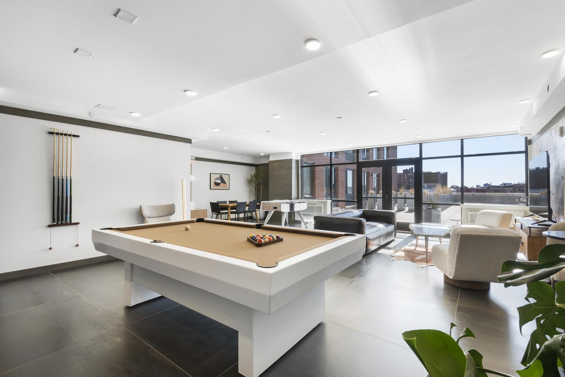 Amenities include a secure attended lobby with a full-time doorman, spacious rooftop terrace with BBQ stations, a dog run & plenty of chairs, tables & lounge chairs. The second-floor lounge includes a pool table, sofa with large flat screen TV, a record player with plenty of records to choose from & a foosball table. Our 2 fully equipped fitness centers have everything you need from cardio machines to strength training & even a yoga room. Last but certainly not least is our business center/co-working space with conference rooms for privacy & a large table with charging stations to spread out and get all your work done. We also have a large laundry room with lots of washers & dryers for tenants. In unit W/D is an available upgrade for all apartments. Wi-Fi is provided in ALL the amenity spaces.