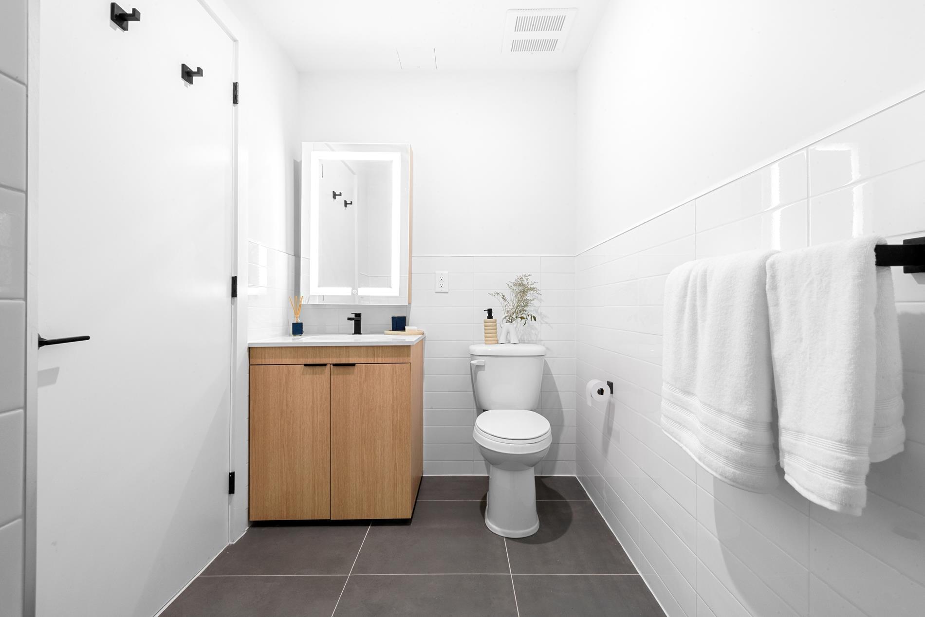The chic bathrooms are also outfitted with Silestone suede countertops and matte black Delta faucet and fixtures, with Porcelanosa white tiling and gray flooring.