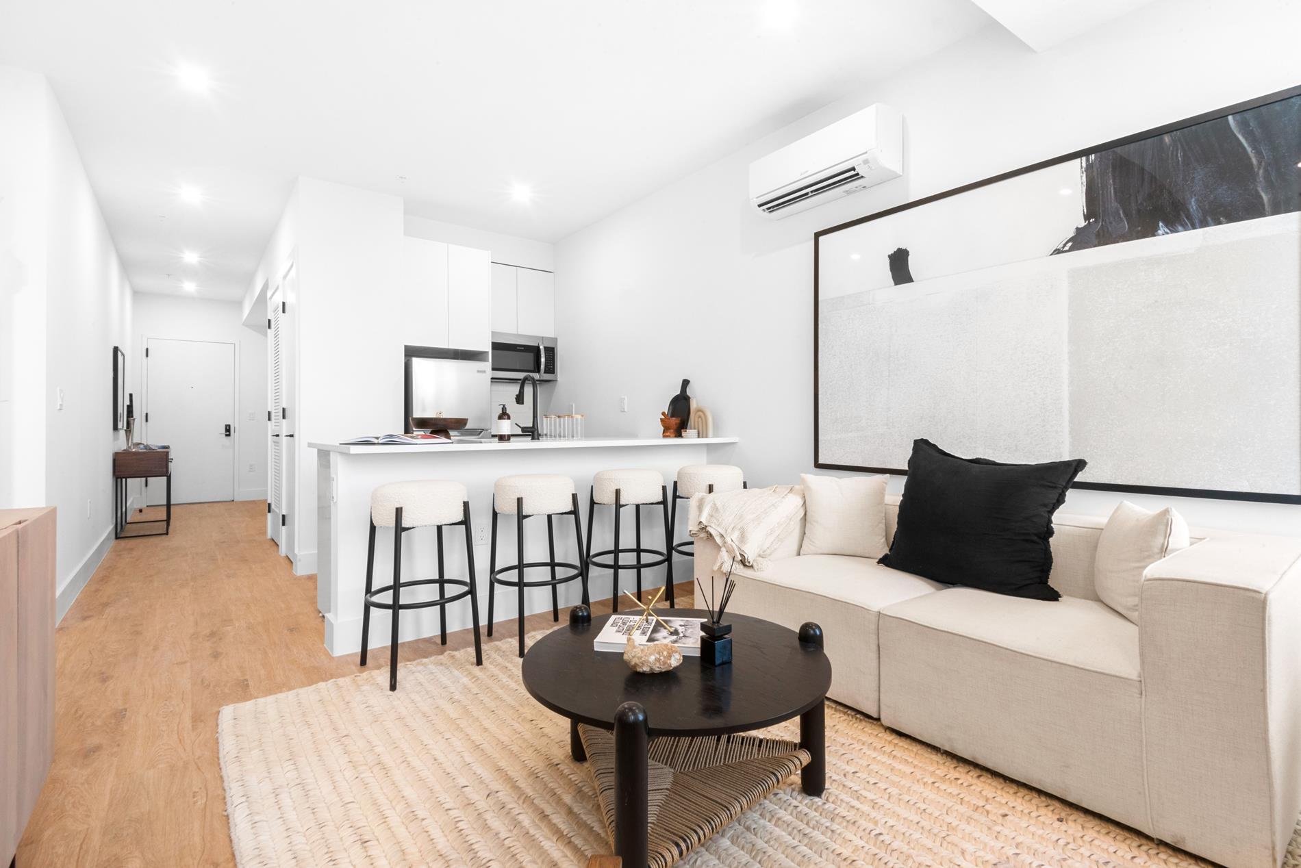 The striking brick exterior facade with its black metal framing is an inviting entry to the well-crafted residences inside. Choose from studio and one-bedroom units, intelligently constructed with premium Aquasense waterproof European oak-style flooring throughout and expansive black framed European-style tilt-and-turn oversized windows that fully illuminate interiors with plenty of natural light. Select apartments feature private terraces, adding a welcome outdoor extension to your living space.