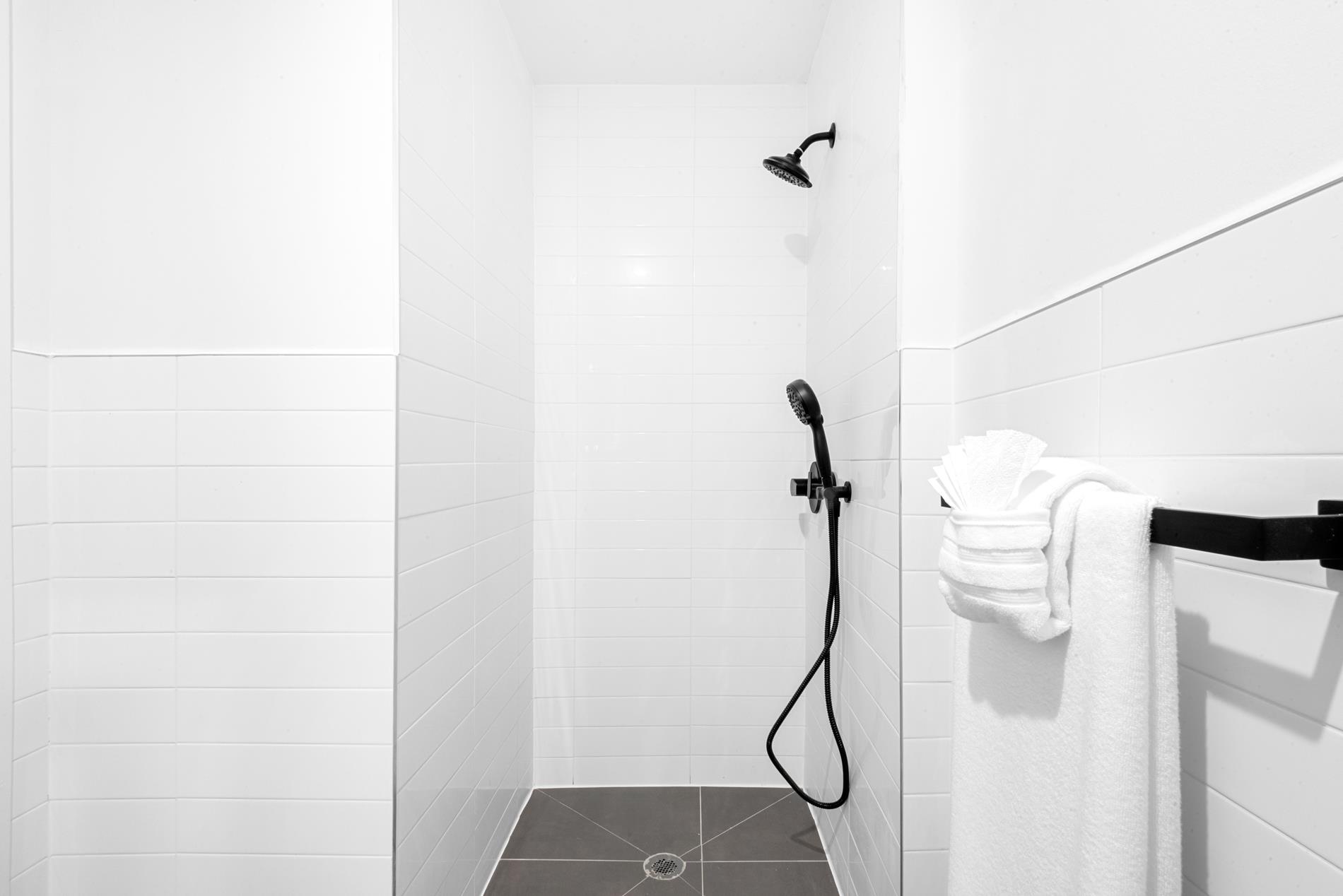 The chic bathrooms are also outfitted with Silestone suede countertops and matte black Delta faucet and fixtures, with Porcelanosa white tiling and gray flooring.