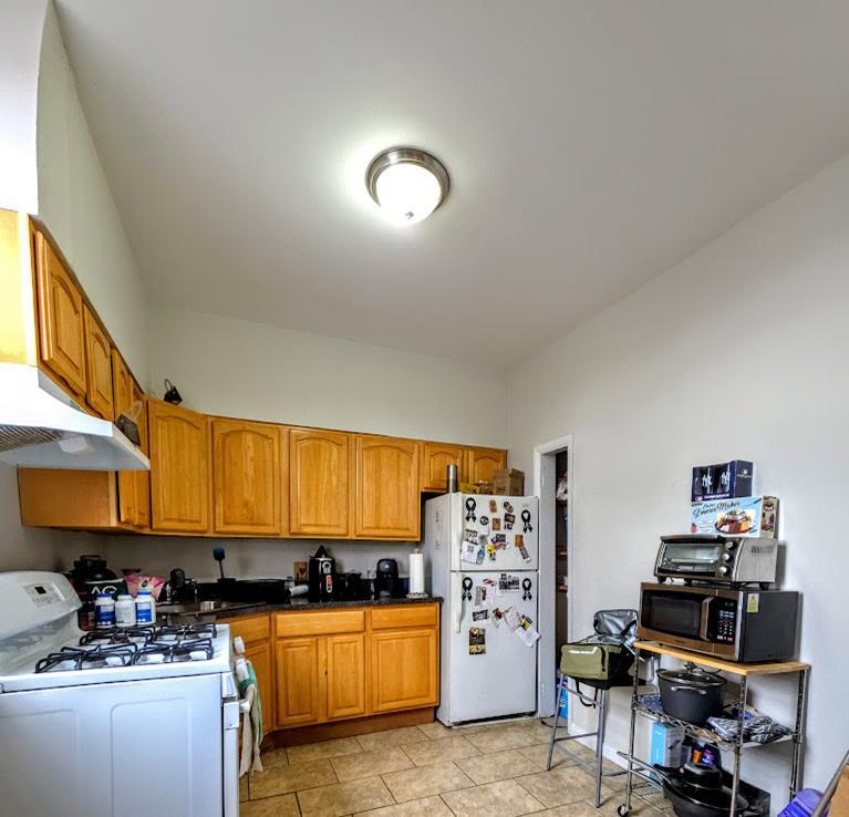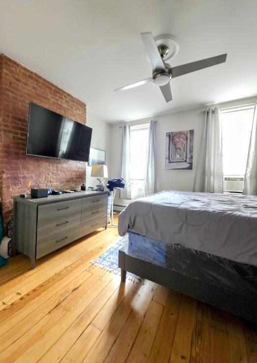 This unique horseshoe-style layout features a bright eat-in kitchen with a pantry, a separate and spacious dining room, and a sun-filled living room with exposed brick. The primary bedroom is east-facing with two windows and double closets, large enough to accommodate a king-size bed and full furniture set. The second bedroom is smaller but includes two closets and can fit a full-size bed or possibly a queen. The apartment also offers hardwood floors throughout, high ceilings, and has been freshly painted.