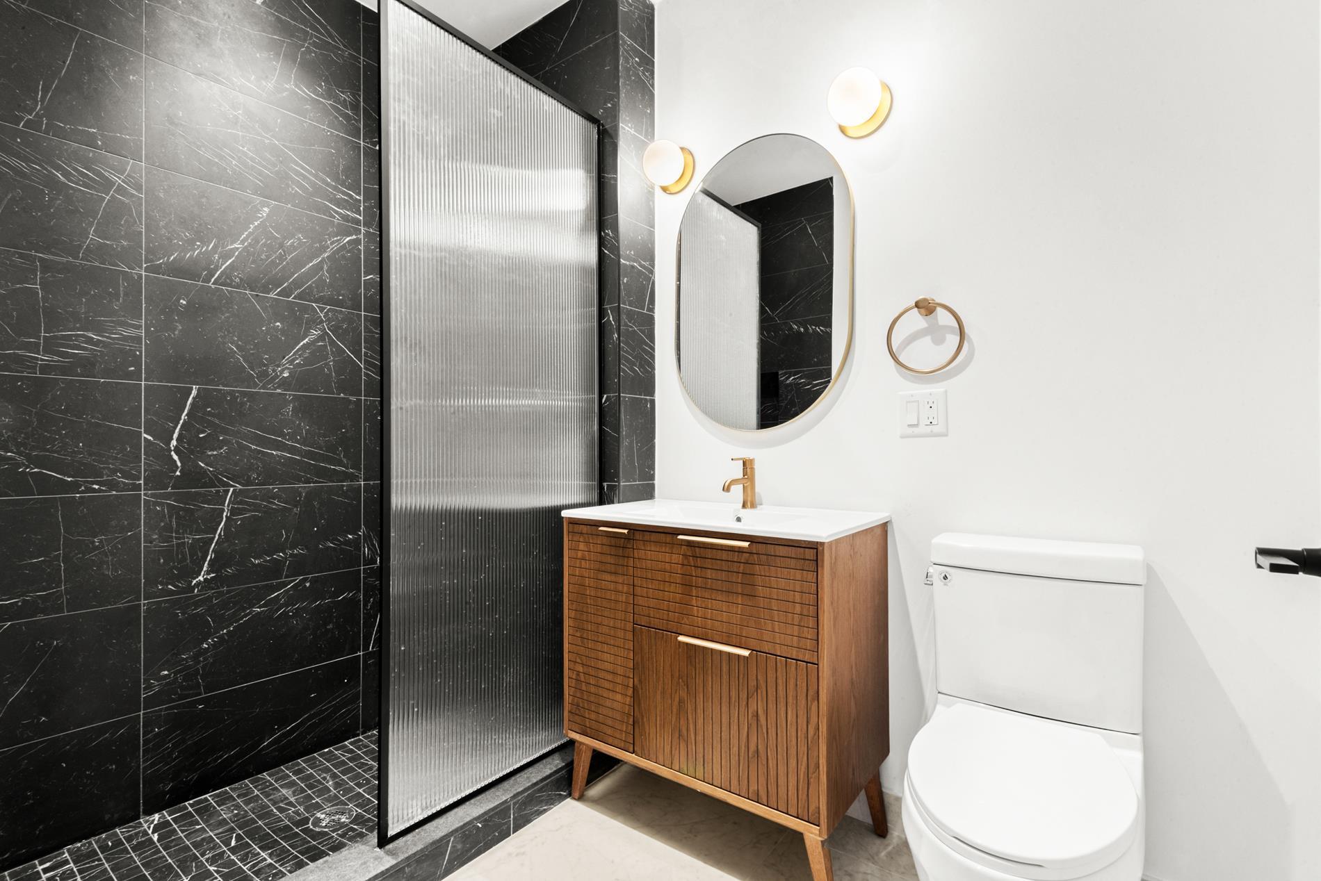In the primary bathroom, you'll find a walnut wood-style vanity with white stone countertops, complemented by a soft-close shower enclosure in clear glass. Marble-style porcelain floor and wall tiles in Nero Marquina complete the high-end look, along with a Delta Bronze shower head and fixtures and white globe sconces in aged brass for the final touches.