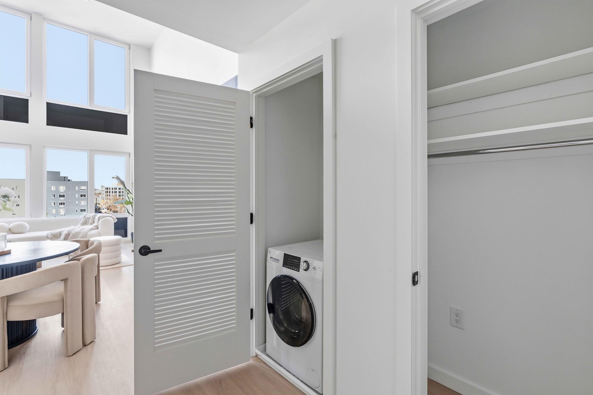 Interiors are thoughtfully designed with elevated details throughout. Chef-caliber kitchens are equipped with stainless steel appliances and gas ranges, and every residence includes an in-home washer and dryer for everyday convenience. Select homes offer private outdoor terraces, while solid-core doors, keypad entry, and camera monitoring provide seamless security. Standard residences feature 9-foot ceilings, with select loft residences featuring soaring ceilings up to 20 feet, creating a dramatic sense of scale, while floor-to-ceiling windows flood every home with natural light.