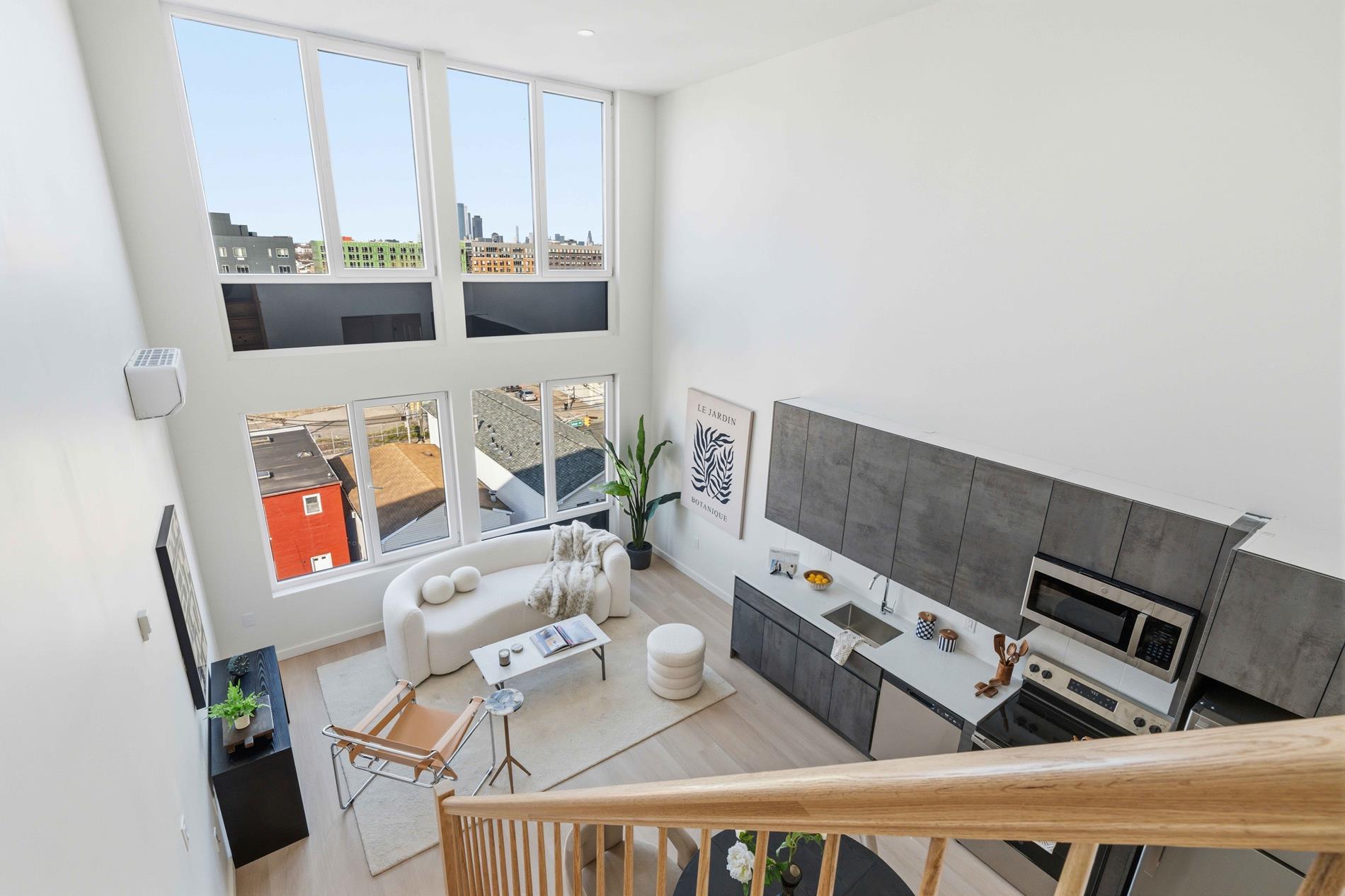 Interiors are thoughtfully designed with elevated details throughout. Chef-caliber kitchens are equipped with stainless steel appliances and gas ranges, and every residence includes an in-home washer and dryer for everyday convenience. Select homes offer private outdoor terraces, while solid-core doors, keypad entry, and camera monitoring provide seamless security. Standard residences feature 9-foot ceilings, with select loft residences featuring soaring ceilings up to 20 feet, creating a dramatic sense of scale, while floor-to-ceiling windows flood every home with natural light.