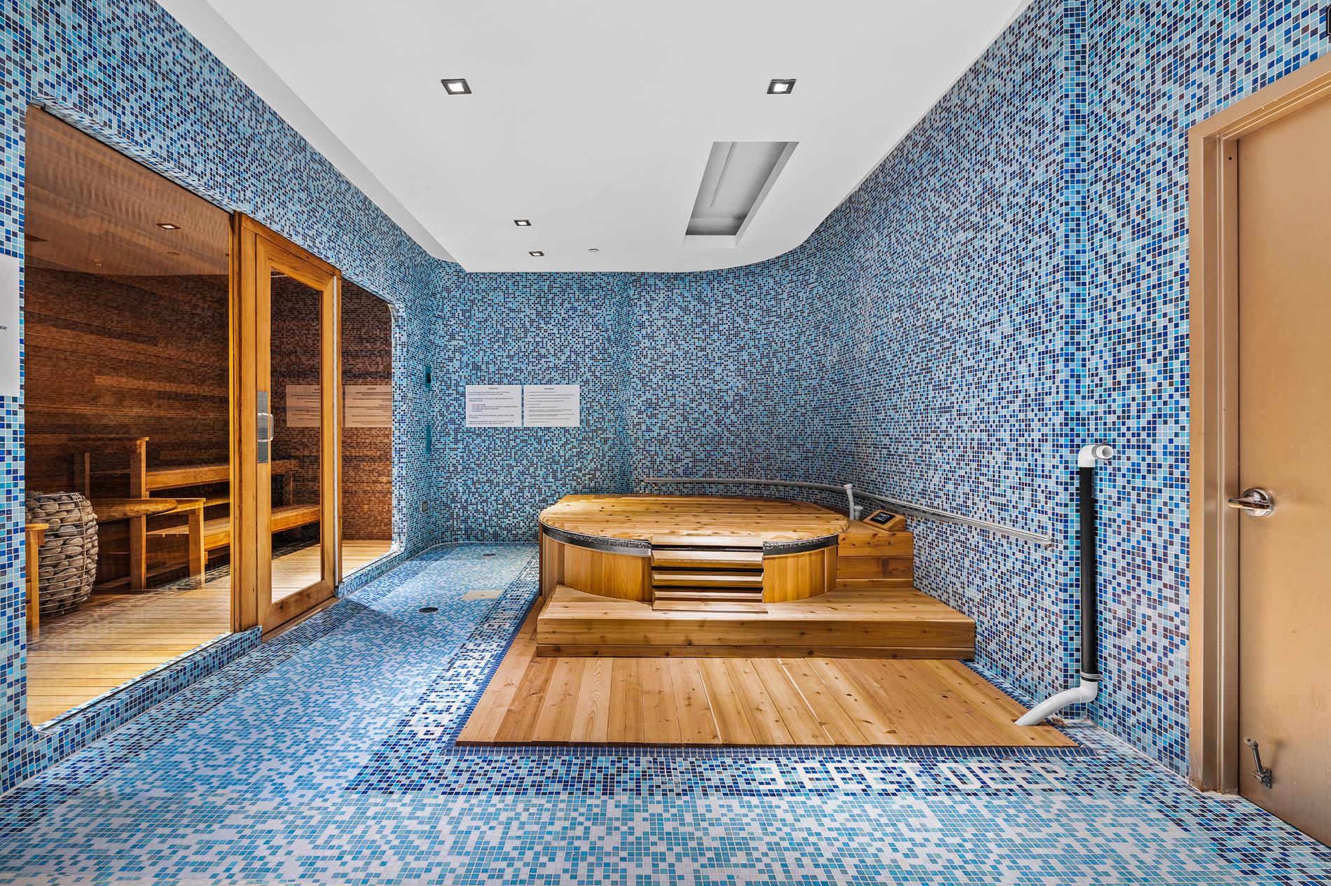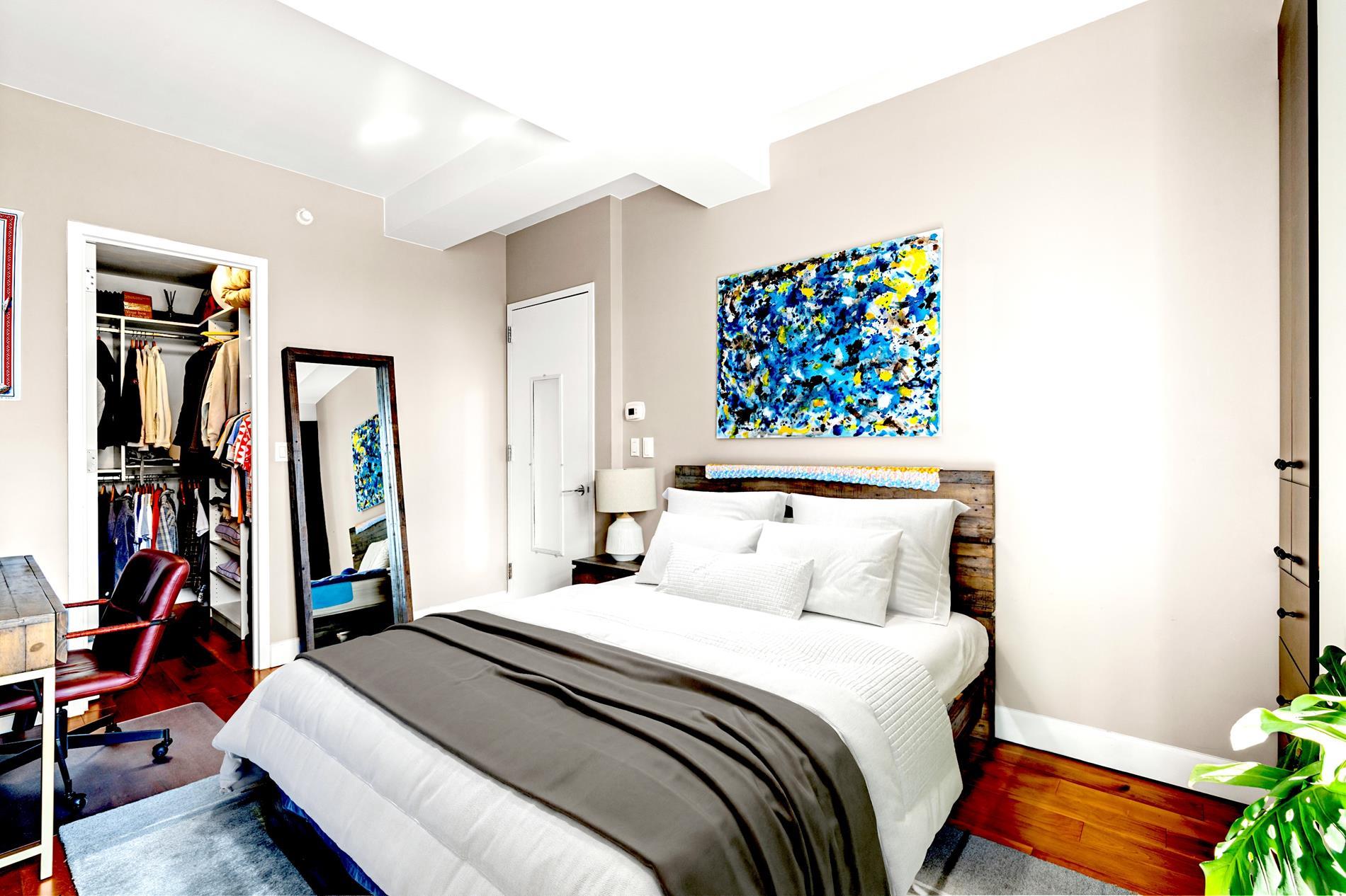 The generously proportioned bedroom easily accommodates a king-size bed with room for a dedicated home office. Storage is thoughtfully designed with a large custom walk-in closet and an additional built-in carbinet. The spa-like bathroom features Italian tile, a deep soaking tub, and a rainfall showerhead.